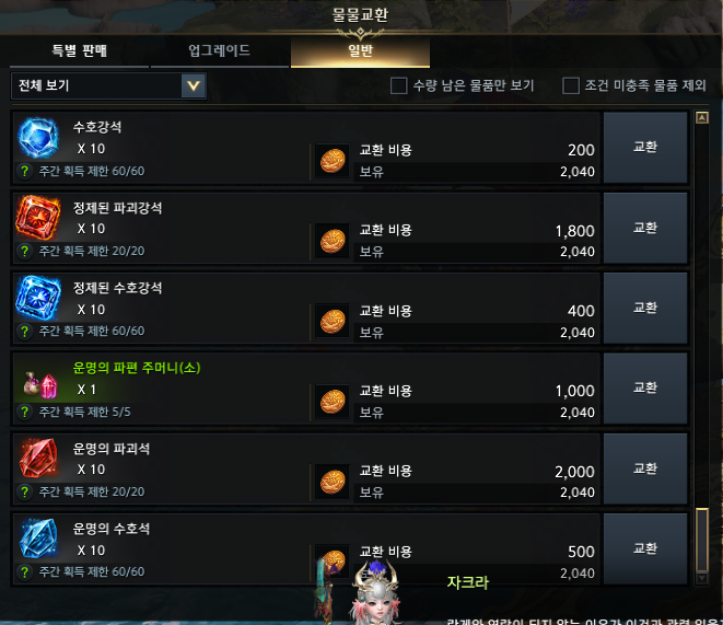 | 물물교환 일반 | 주간 획득 제한 | 수량 | 총 횟수차감(사용주화) |